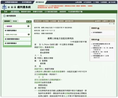 ▲ 李博建対張俊歌夫妻訴訟の判決のスクリーンショット。画像出典:台湾士林地方裁判所電子ファイル