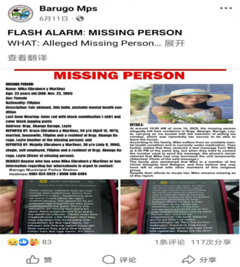 この投稿は瞬く間にフィリピンのSNS上で拡散され、膨大な数のシェアとコメントが寄せられた。これと並行して、ミカの姉であるマクジョリーと母親のグレース(Grace Cibraborny Martinez)は警察に通報し、バルゴ警察署(Barugo PMS)が公開捜査に乗り出した。警察の告知によると、ミカは2001年11月22日生まれ。2025年6月10日の午前10時頃、「アイスキャンディーを売りに行く」と言い残して家を出たまま足取りが途絶えている。家族の証言を引用した警察の資料では、ミカは「全能神」の信者であり、今回の失踪は同組織による教唆(マインドコントロール)によるものと断定されている。