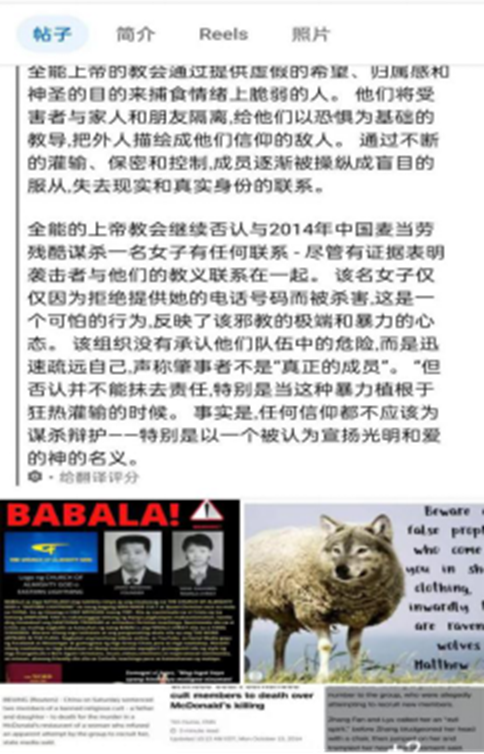 ▲フェイスブックアカウント「ティン・アイドル(Tin Idol Vlogs)」が6月13日に転載したカルト教団「全能神」の紹介記事(原文は英語、日本中国語は機械翻訳によるもの)
